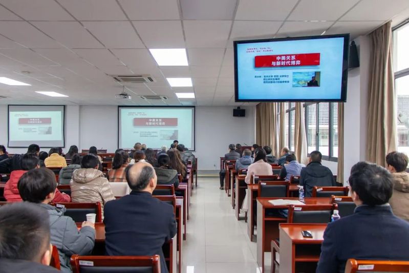 最后,黄水林书记作题为“中美关系与新时代博弈”的专题讲座。黄水林教授以时间为轴线,用丰富的历史事件作为切入点,深入阐述了中美关系的发展史、新中国崛起史,深度解析了国际形势,介绍了历史发展规律和大势,具有很强的思想性、理论性、指导性,进一步增强了我们在新时代坚持和发展中国特色社会主义的信念和信心。