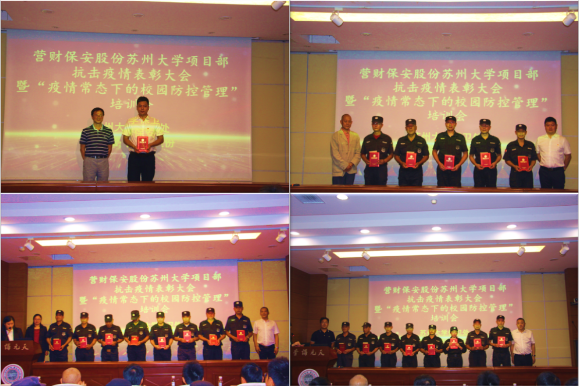 2020年寒假,新型冠状病毒疫情席卷而来。保安队伍中的党员同志身先士卒,带领全体队员主动放弃假期轮休,放弃与家人的相聚欢颜,冲锋在第一线,战斗在最前沿,勇敢地坚守在最危险的工作岗位上,用他们的担当、忠诚、勇气和奉献,为校园的安全稳定做出重大贡献;他们用平凡的实干精神书写着伟大的人生赞歌,共同筑起了苏州大学疫情防控的“钢铁长城”。保卫(部)处党支部与苏州营财保安股份有限公司苏大党支部联合举办表彰会,对在疫情防控中做出贡献的先进个人和先进集体进行表彰。